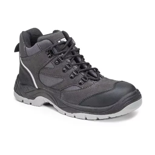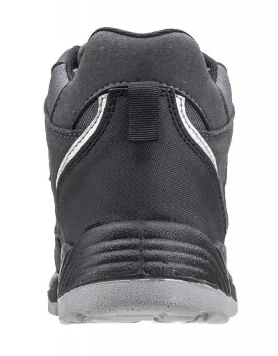 • biztonsági védőlábbeli fekete velúr bőrből, szellőző és vízálló antracit szürke hálós betétekkel