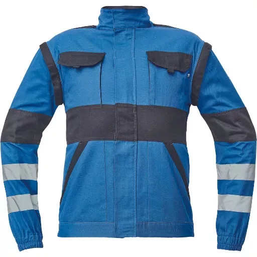 • férfi cipzáras munkakabát levehető újakkal; 2 első zseb, 2 mellzseb; megerősítés a váll és könyök részeken; rugalmas mandzsetta és alsó derékszegély; fényvisszavető csíkok az ujjakon és a kabát hátán, anyag: 100% pamut, anyagvastagság: 260 g/m2