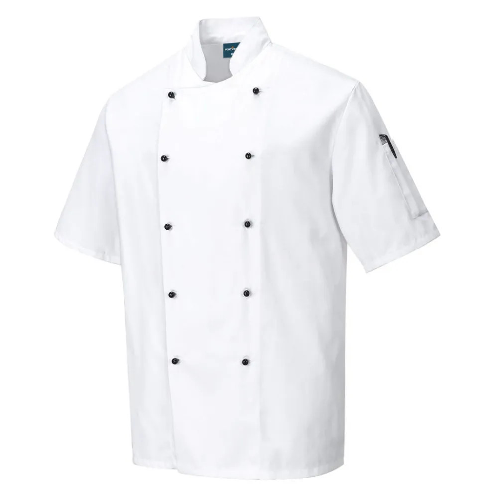 - Anyag: Kingsmill 190, 65 % poilészter,35% pamut meleg munkakörnyezetre tervezett új, rövid ujjú séfkabát klasszikus szabás, magas minőségű, könnyen kezelhető alapanyag kivehető gombok ujjzseb
